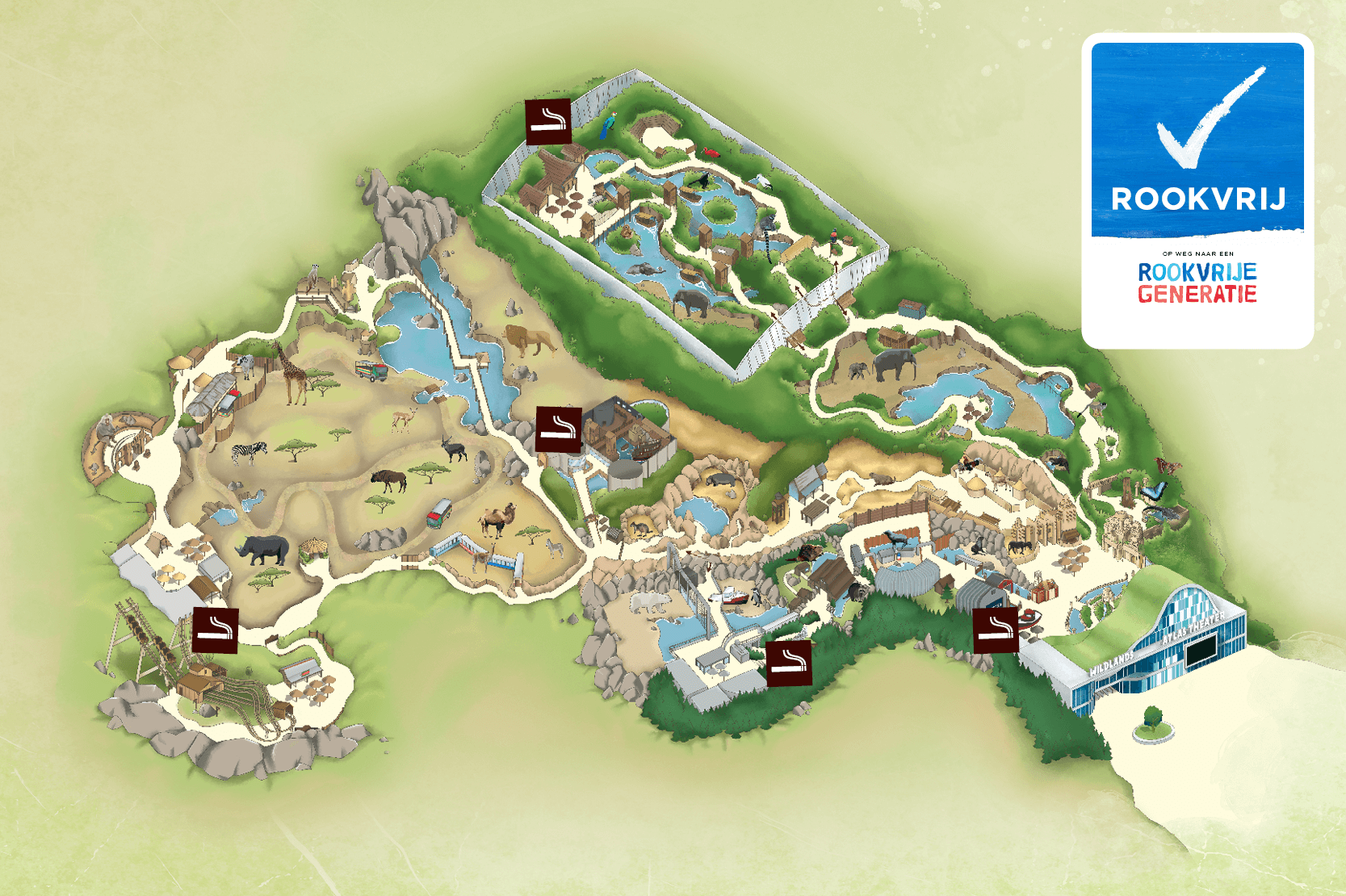 WILDLANDS draagt bij aan een Rookvrije Generatie. Er mag op het park niet langer in het zicht van kinderen gerookt worden. Dit geldt ook voor e-sigaretten. Op het 24 hectare grote park zijn vijf volledig afgeschermde rookplekken gerealiseerd. Deze zijn te vinden op het Mondiala Plein, bij Momma’s Restaurant, Animazia, Rimbula Restaurant en bij Sonar Station (zie plattegrond).